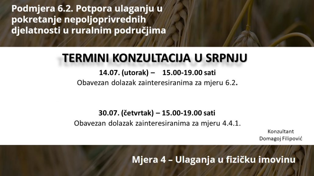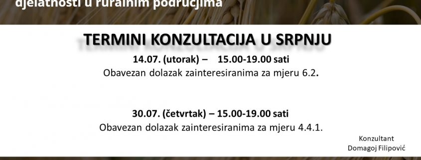 Termini konzultacija za sve OPG-ovce, poduzetnike i ostale zainteresirane sa područja općine Cetingrad za srpanj.