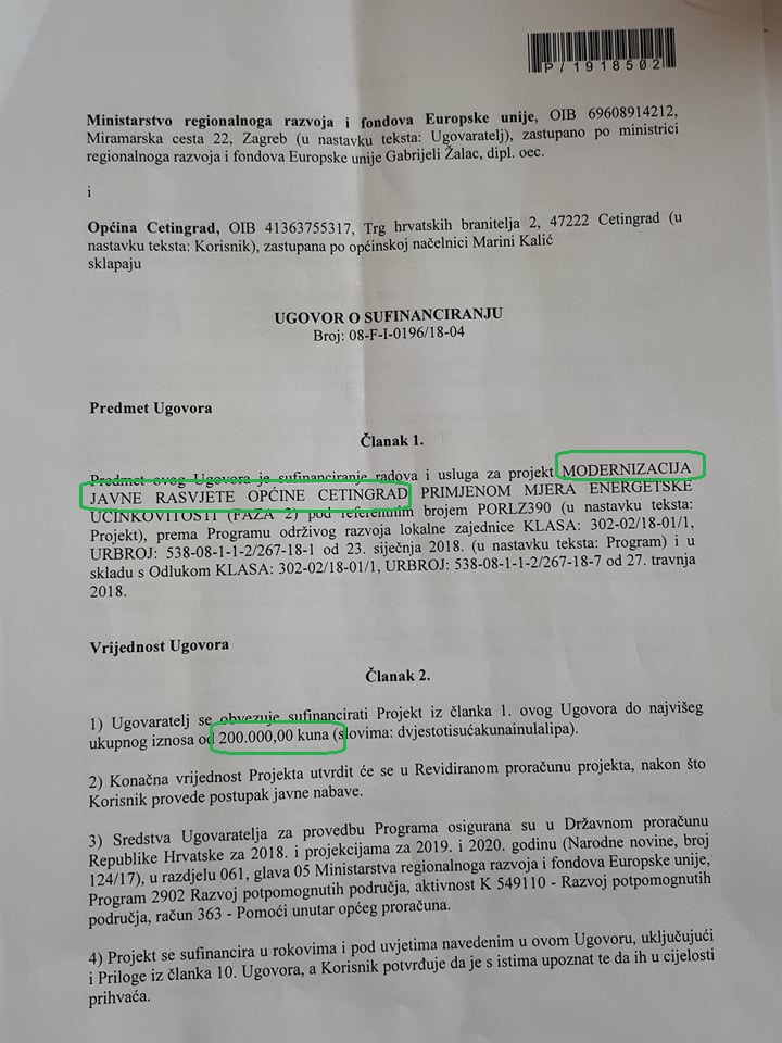 Potpisan je Ugovor sa Ministarstvom regionalnog razvoja za modernizaciju javne rasvjete u općini Cetingrad